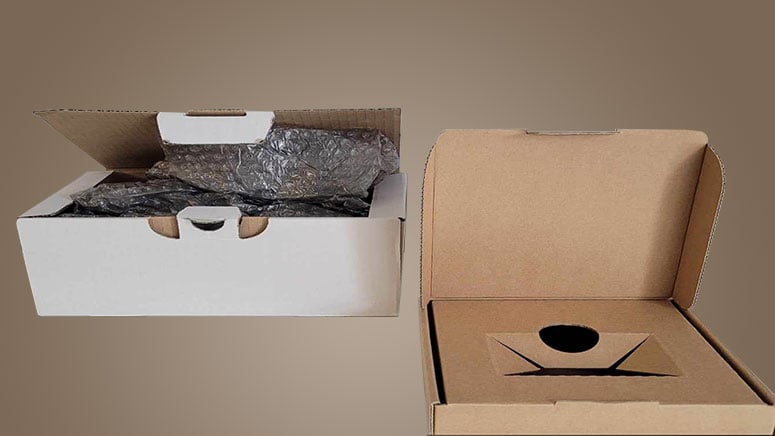 Vid projektets start använde kunden 12 olika standardlådor, stora mängder plastbaserat fyllnadsmaterial – och nära 2000 rullar tejp per år.